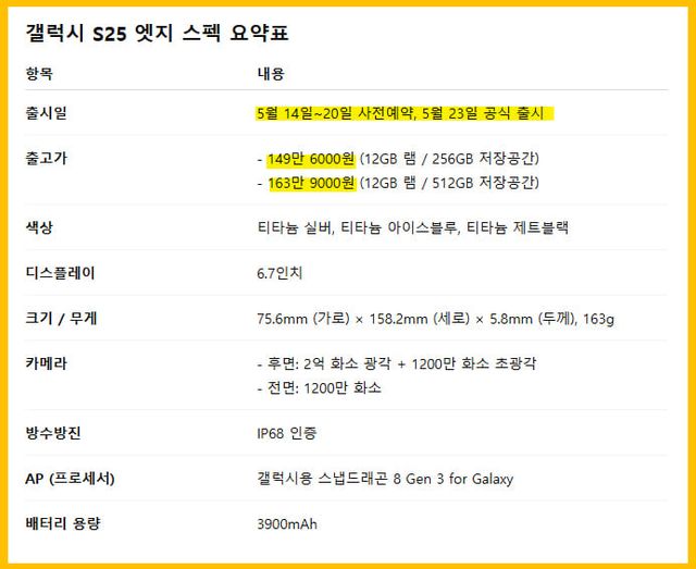 '갤럭시 S25 엣지' 가격, 두께, 무게, 출시일