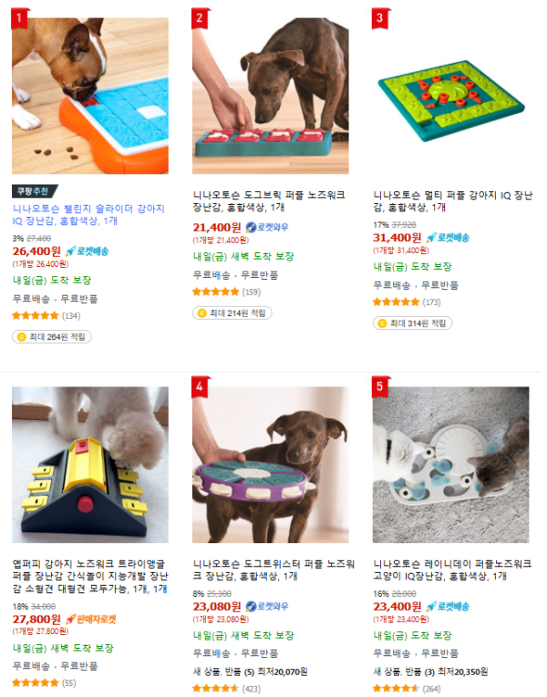 → 플라스틱 퍼즐형! 강아지가 간식 찾느라 10분 이상 집중하게 되고, 에너지 소모도 높아요