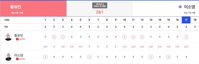 ※UP(승) DN(패) U(홀포기 승) X(홀포기) H(홀 동률) Tie(A/S)(코스동률) n & n(승수&남은홀수) n Holes(연장홀수)