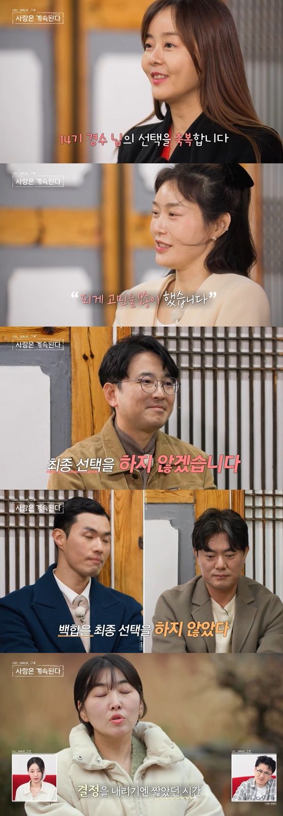 동백은 "좋은 추억 만들어 준 14기 경수 님 감사드린다"며 "사랑스러운 국화랑 14기 경수 님의 선택을 축복한다"고 두 사람의 인연을 응원하며 최종 선택을 포기했다.