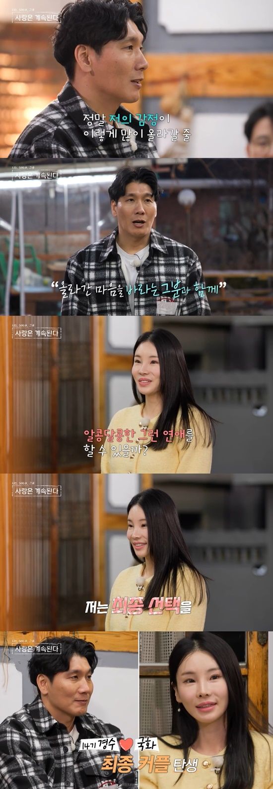 국화 역시 경수의 마음에 화답했다. 그는 "올해 정말 가장 큰 선물을 3박 3일 동안 받은 것 같다. '알콩달콩한 연애를 이제는 못하겠지?' 생각하고 살았다"며 "근데 감정을 다시 느끼게 해준 분에 감사하다"고 말하며 14기 경수를 선택, 첫 커플의 탄생을 알렸다.