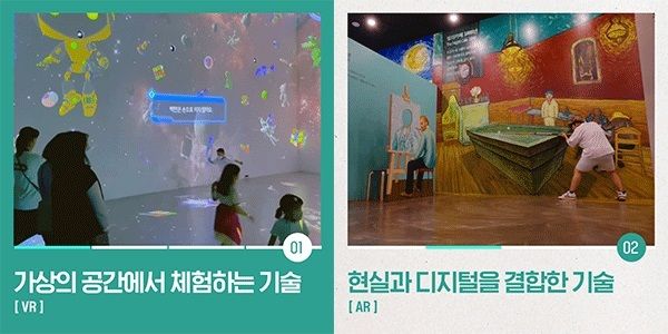 ‘가상현실’을 말하는 ‘VR’은 컴퓨터 기술을 활용하여 현실과 유사한 가상의 공간이나 환경을 만들어 내는 기술이다. 미술관, 박물관에 직접 가지 않아도 어디서든 전시를 관람할 수 있으며 훼손된 문화유산을 3D로 복원하여 가상으로 체험할 수 있어 최근 문화예술 분야에서 주목받고 있다.