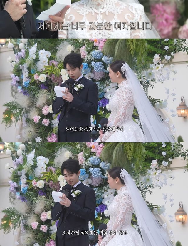 이어 신랑 최시훈의 깜짝 이벤트가 이어졌다. 양복 안주머니에서 준비한 편지를 꺼낸 그는 "제가 굉장히 내성적이어서 와이프가 여러가지 해달라고 했던 게 있었는데 아무것도 못 해줘서 너무 미안하기도 해서 작은 이벤트 준비했다"고 말문을 열었다.