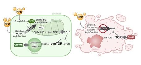 [(좌측) 암 세포는 고지방 식이(HFD)로부터 지방산을 흡수하여 아실-카르니틴(LC, MC, SC 형태)으로 전환한 후, 미토콘드리아에서 FAO(지방산산화)를 통해 아세틸-CoA 물질을 생성한다. 아세틸-CoA는 TCA 회로에서 NADH로 전환되며, 이는 전자 전달 사슬(ETC)을 통해 ATP(에너지)를 생성하는 데 사용된다. ATP가 많아지면 세포 성장 신호를 조절하는 단백질(p-mTOR)이 활성화되며, 이는 세포 성장에 중요한 사이클린 D1과, 세포 내 DNA 손상 감지 및 수리에 중요한 역할을 하는 PARP의 발현을 촉진시킨다. 이러한 생존 프로그램은 결과적으로 암 세포의 성장을 촉진한다.