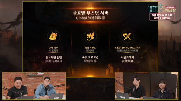 이어서 한국과 대만 서버 통합 계획이 소개됐다. ‘혼돈의 광야’를 재 오픈하는 과정에서 내려진 결정으로, 향후 한국과 대만 이용자들은 완전히 동일한 버전의 게임으로 함께 ‘히트2’를 즐기게 된다. 오는 8월 서버 통합을 목표로 두고 있으며, 서버 통합 이후에는 한국 대만 통합 총 70개 서버에서 다른 서버로의 이전도 지원한다. 외에도 오는 28일 부스팅 서버 시즌7을 선보이는 한편, 향후 한국과 대만 서버 통합 글로벌 부스팅 1개월간 더 운영될 예정이다.