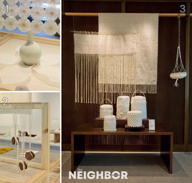 1 최희주 작가의 코르사주 조각보와 화병을 감싼 목련 보자기. 2 베틀과 이어지는 실로 좌대를 완성했다. 3 비닐로 만든 실을 엮어 원단을 직조하는 김태연 작가의 밥멍덕.