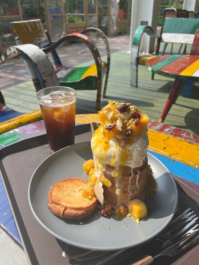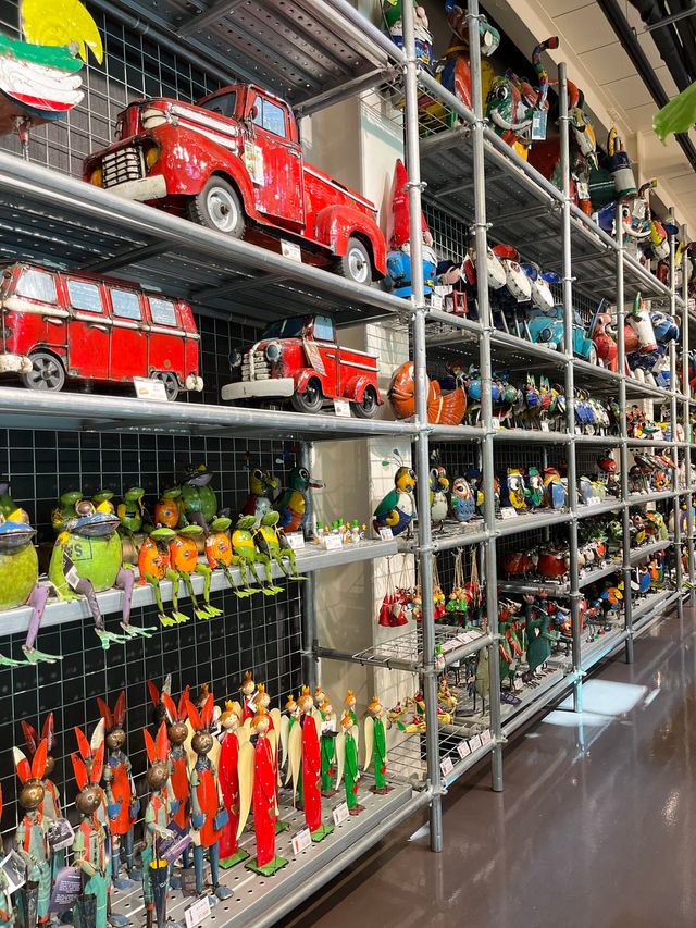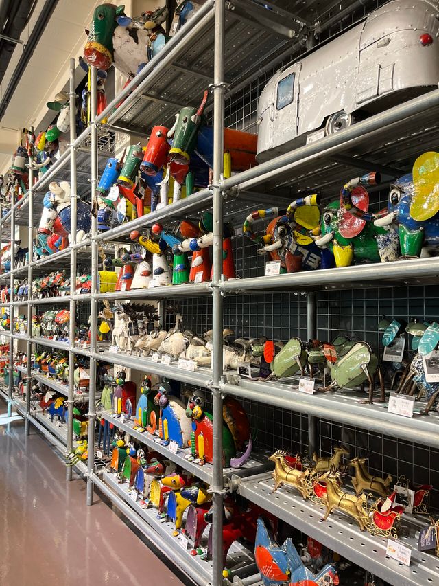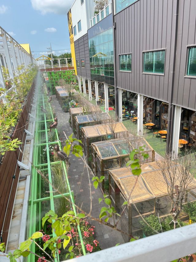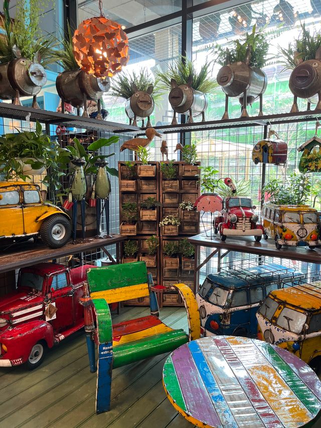 카페 내부는 예술 작품처럼 꾸며진 업사이클링 소재로 가득합니다. 철제 드럼통과 낡은 목재, 톱니바퀴 등이 조화를 이루며, 식물들과 어우러져 차가움과 싱그러움의 대비를 보여줍니다. 식물이 벽과 천장을 장식하여 살아 있는 느낌을 주며, 감각적인 공간을 만들어냅니다.