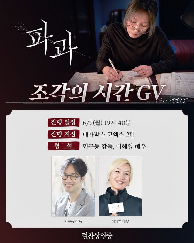 이번 GV에는 극강의 액션과 깊이 있는 드라마를 완벽하게 소화해낸 ‘조각’ 역의 이혜영 배우와 장르를 넘나드는 연출력으로 호평을 받은 민규동 감독이 참석한다. 선보이는 굿즈마다 뜨거운 반응을 얻었던 영화인 만큼 참석한 모든 관객에겐 ‘파과’의 메인 및 스페셜 포스터 2종을 제공한다.