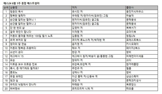 한편, 80만 구독자를 보유한 주언규의 신작 에세이 '혹시, 돈 얘기해도 될까요?'가 15위에, 밀리언셀러 작가 하태완의 신간 '우리의 낙원에서 만나자'가 19위로 진입하며 독자들의 기대를 모으고 있다. eBook 분야에서는 EBS FM 시리즈 'EBS 라디오 입이 트이는 영어 2025년 6월호'가 새롭게 1위에 등극하며 영어 학습자들의 꾸준한 관심을 입증했다.