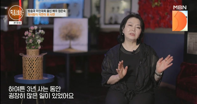 이날 정은숙은 배우 활동을 중단한 이유에 대해 “작품 하면서 만난 첫사랑(나한일)과 사이가 안 좋아지고 헤어지면서 내가 스스로 방송국을 안 가게 됐다”고 밝혔다.