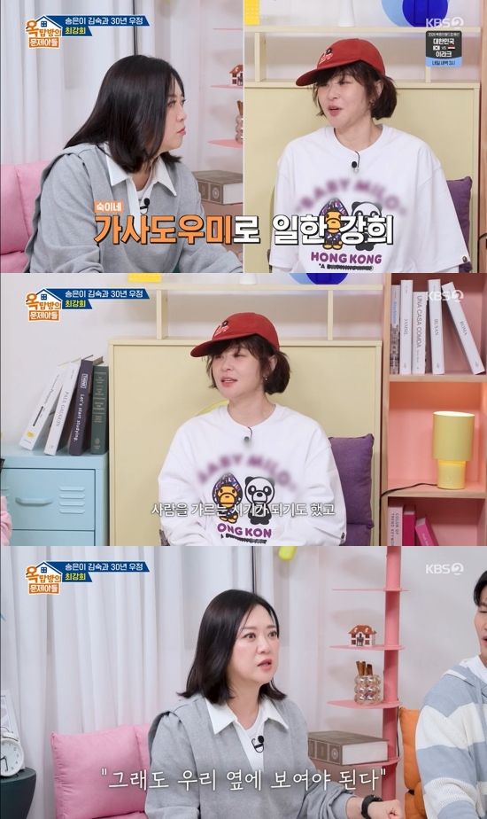 옆에서 지켜보던 송은이는 "당시 최강희가 번아웃이 세게 왔다"며 "쉬는 기간은 나쁘지 않은데 건강하게 쉬는 게 중요하게 생각해서 (가사도우미를) 제안했다. 다행히 강희가 잘 받아들여줬고 그 시간을 오롯이 자기 성장에 잘 가져갔다"고 애정을 표했다.