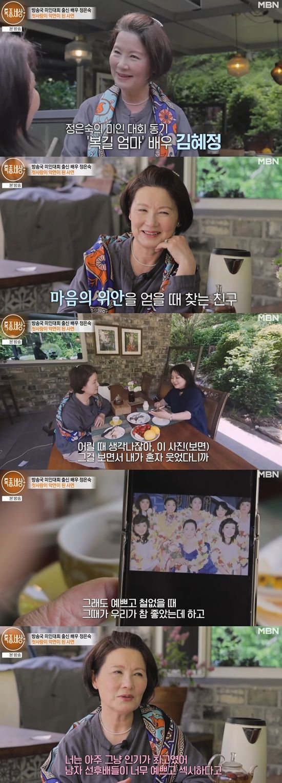정은숙은 친구이자 데뷔 동기 배우 김혜정을 찾았다. 정은숙은 김혜정에게 "어릴 때 생각난다. 그걸 보면서 혼자 웃었다. 예쁘고 철 없을 때 참 좋았다. 다 예뻤다"라며 사진을 보여줬다.