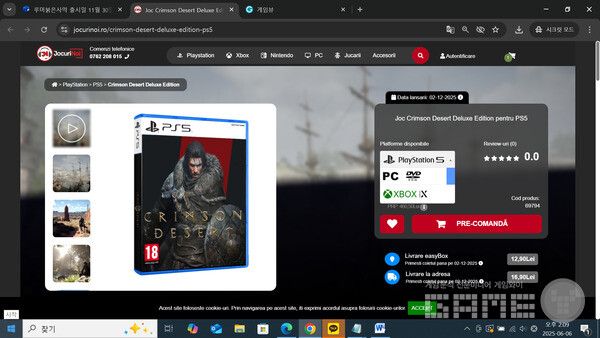 펄어비스는 ‘붉은 사막’에 대한 정확한 출시일은 공개하지 않고 올해 4분기에 출시할 것이라고 밝혀왔다. 하지만 루마니아의 한 게임 판매 사이트에서는 ‘붉은 사막’ 사전예약 페이지가 오픈됐다. 해당 사이트를 보면 '붉은 사막 디럭스 에디션' 사전 주문 페이지를 통해 출시일과 가격, 그리고 디럭스 에디션 구성품이 공개된 것을 확인할 수 있다. 해당 사이트에 의하면 ‘붉은 사막’ 출시일은 11월 30일이며 디럭스 에디션 가격은 409.99레이(약 125,000원)라고 게재되어 있다. 또한 디럭스 에디션 구성 상품은 게임 본편 패키지와 스틸팩, 브로치, 직물 지도 등 다양한 상품으로 구성된 것을 확인할 수 있다. 다만 해당 정보에 대한 진위여부는 현재로서는 알 수 없다.