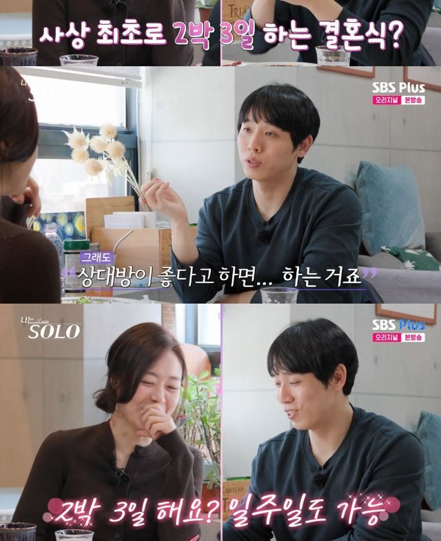 영식은 "없다"면서 "결혼식보다는 사랑하는 사람과 결혼하는 게 더 중요하다"고 답했고, 이어 현숙이 "근데 신부가 너무 로망이 있어서 거창하게 하고 싶다(고 하면)"라고 묻자 "거창하게 해야죠. 2박 3일 하고 싶다? 해야죠"라며 능청스럽게 대답했다.