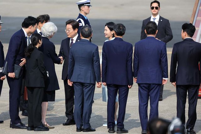 이재명 대통령이 캐나다에서 열리는 주요7개국(G7) 정상회의 참석을 위해 16일 오후 경기도 성남 서울공항에서 배웅하러나온 타마라 모휘니 주한 캐나다 대사와 인사를 나누고 있다. / 뉴스1
