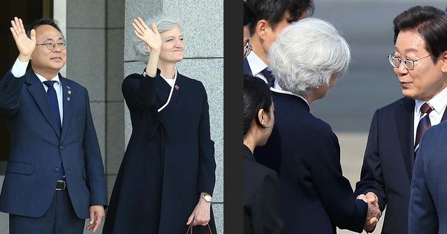 공항에는 강훈식 대통령비서실장, 민병기 더불어민주당 원내대표, 우상호 정무수석, 고기동 행정안전부 장관 직무대행 등이 이 대통령을 배웅하기 위해 나왔다. 이들 사이에서 은발의 모휘니 대사가 입은 전통 한복은 독보적인 존재감을 뽐냈다. 모휘니 대사는 2023년 5월 주한 캐나다 대사로 부임한 최초의 여성 대사다. 1993년부터 캐나다 외교부에서 30년 넘게 외교 경력을 쌓아왔다.