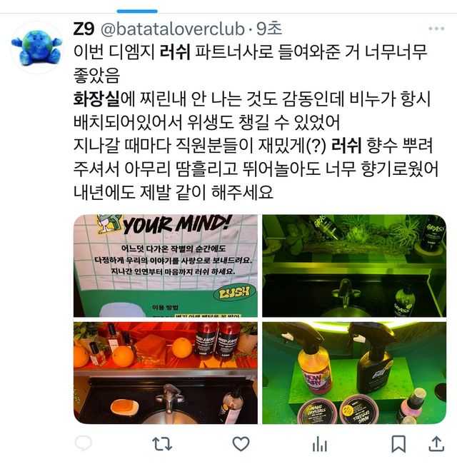 러쉬코리아 관계자는 “DMZ 페스티벌 참여를 시작으로, ‘마음샤워’ 캠페인을 다양한 국내 페스티벌과 오프라인 현장으로 확장해 나갈 계획”이라고 전했다. 다음은 어떤 페스티벌의 화장실이 향기롭고 쾌적하게 바뀌게 될까.