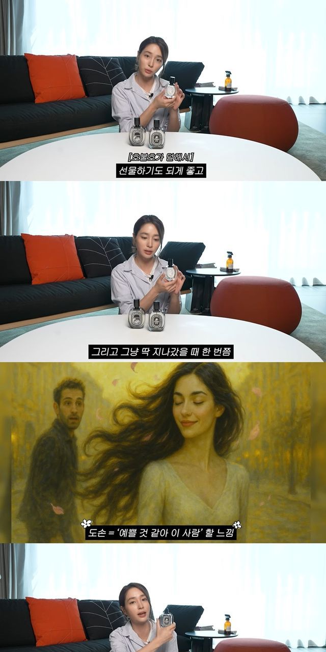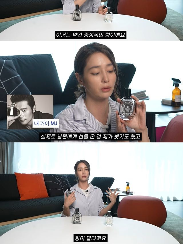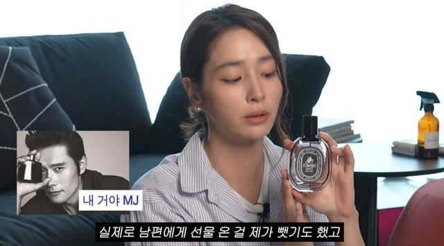 또 다른 중성적인 향수에 대해서는 "남편에게 선물 온 걸 제가 뺏기도 했다. 이걸 여자가 뿌리면 되게 향이 달라진다. 중성적인 향을 되게 좋아한다. 전쟁에서 이기고 온 장군이 집에 들어왔을 때 냄새 같은 느낌"이라고 전했다.