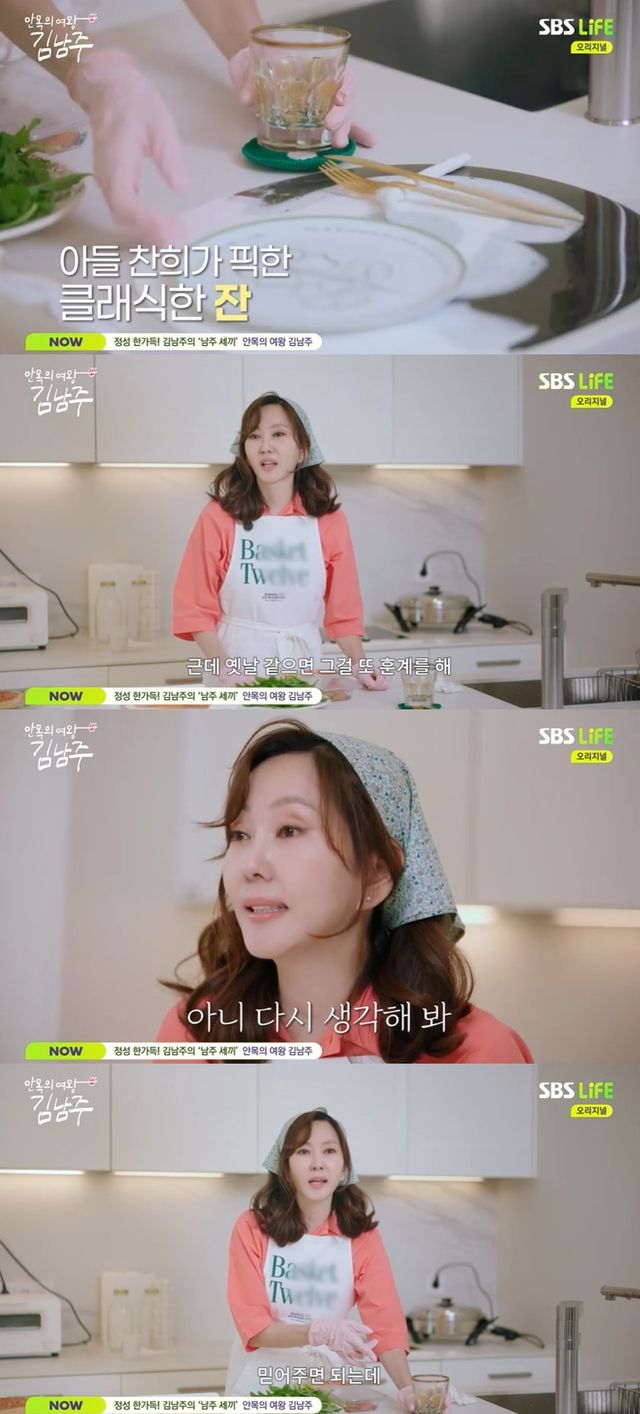 김남주는 "아들에게 이 접시에 어울리는 잔을 고르라고 했었다"며 컵을 소개하더니, "얘(접시)랑 얘(컵)랑 안 어울리는 거 같은데 이걸 고르더라. 왜 이걸 골랐냐고 했더니 좋아보여서라고 했다"고 당시를 회상했다.
