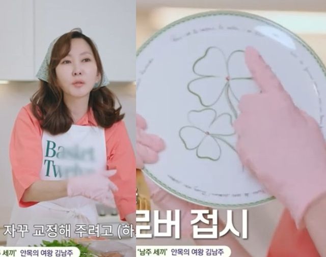 귀여운 네잎클로버 접시를 자랑한 김남주는 "이 접시는 남편과 D브랜드에 갔다가 네잎클로버가 있길래 아이들에게 행운이 오길 바라며 두 개를 샀다"며 명품 브랜드의 접시임을 밝혔다.
