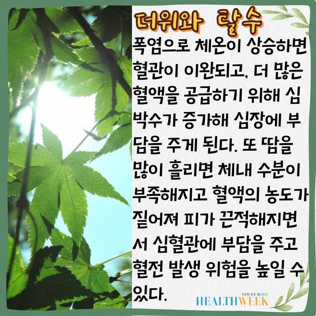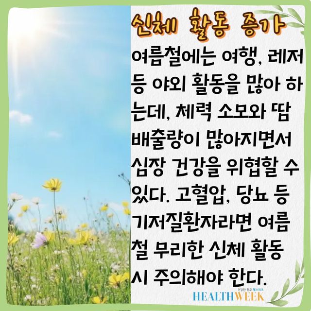 여름철은 심장 건강에 각별한 주의가 필요한 시기이다. 특히 고령자나 심혈관 질환을 앓고 있다면 더욱 심장 건강 관리에 힘써야 한다. 여름철 심장 건강을 악화시키는 요인을 알아보자.