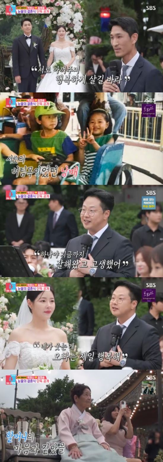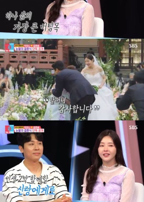 특히 박하나는 엄마를 대신해 할머니의 손을 잡고 입장했다. 박하나는 "할머니가 지금 93세다. 그런데 할머니가 치매가 왔는데, 예쁜 치매다. 다행하게도 결혼식날 할머니 컨디션이 좋으셨다"고 했다. 이어 "부모님이 바쁘셔서 할머니가 키워주셨다. 엄마보다 더 엄마라고 부를 수 있는 존재라고 해야하나..."라면서 눈물을 보였다.