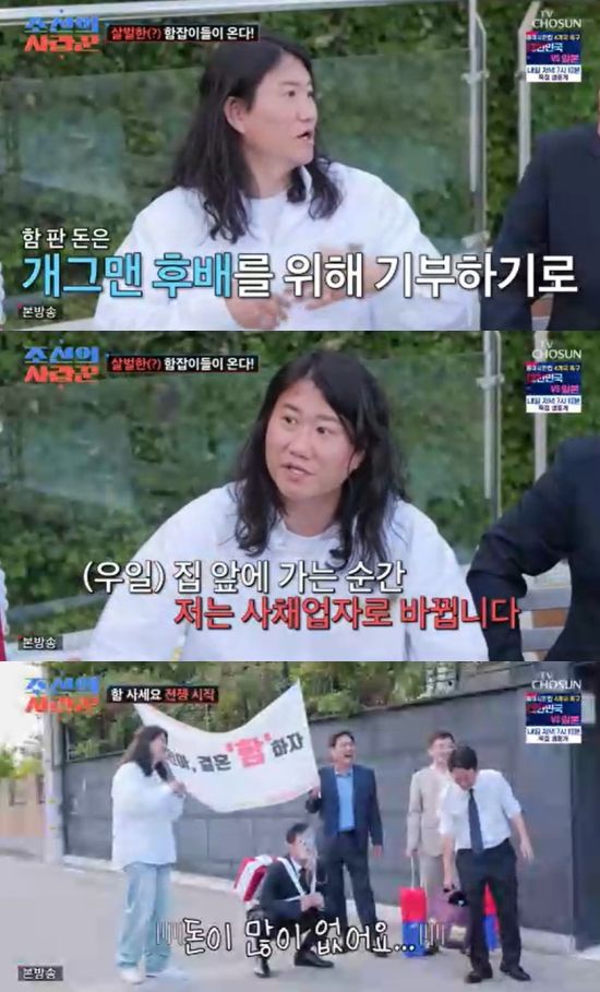 임우일은 "개그콘서트 하는 후배들을 위해서 뭔가 컴퓨터라든지 프린트라든지 그런 걸로 기부금을 주자. 왜냐하면 김지민 선배랑 김준호 선배 둘 다 KBS 공채니까"라며 제안했고, 김대희는 "너무 좋다. 무조건 400만 원에 걸칠 때까지 문지방 넘으면 안 된다"라며 맞장구쳤다. 임우일은 "집 앞에 가는 순간 저는 사채업자로 바뀐다"라며 큰소리쳤다.