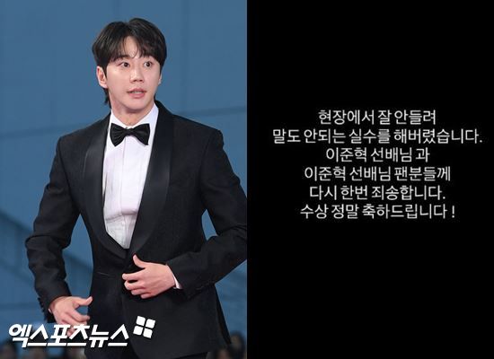 이준영은 18일 자신의 개인 채널에 "현장에서 잘 안 들려 말도 안 되는 실수를 해버렸습니다. 이준혁 선배님과 이준혁 선배님 팬분들께 다시 한번 죄송합니다. 수상 정말 축하드립니다"라는 글을 남겼다.