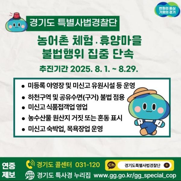 [경기연합신문 ] 경기도가 8월 1일부터 29일까지 도내 124개 농어촌 체험․휴양마을에서 발생하는 다양한 불법행위를 집중 단속한다.