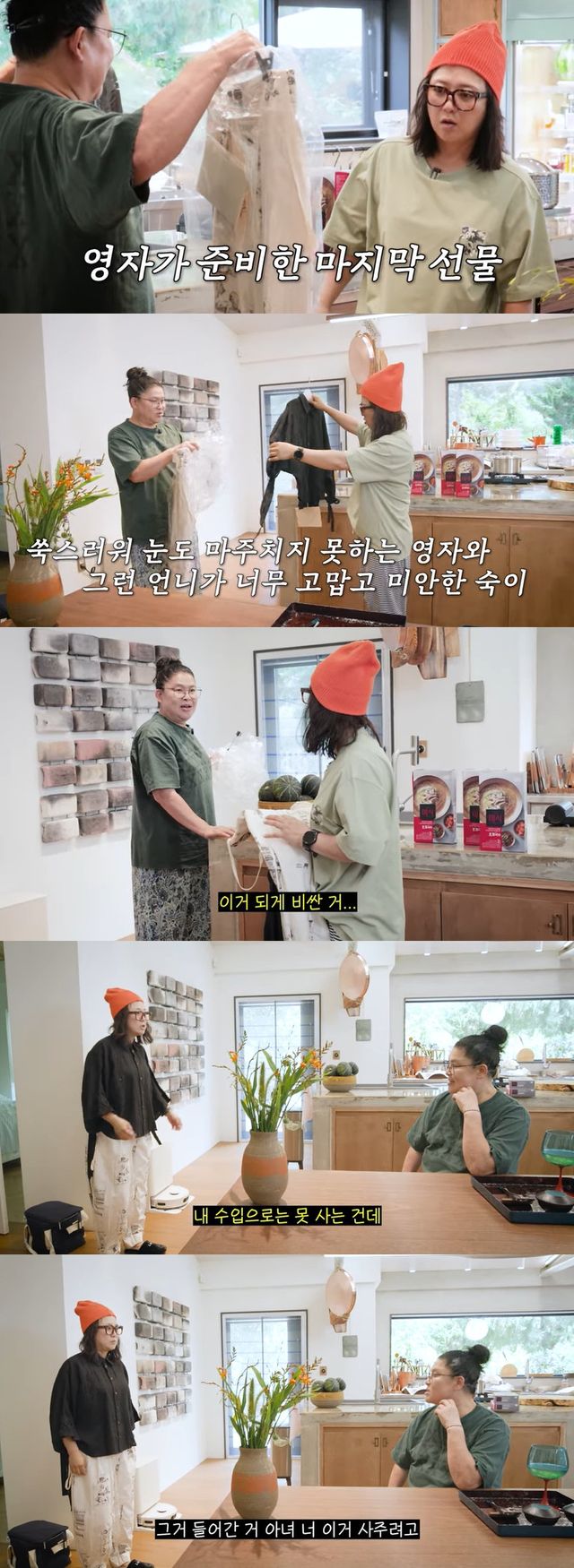 이어 이영자는 "비싼 집 가서 사 왔다. 스타일이 마음에 안 들어도 비싸니까 그냥 입어"라며 또 다른 선물을 예고했고, 이에 김숙은 "또 있어?"라고 놀라는 모습을 보였다.