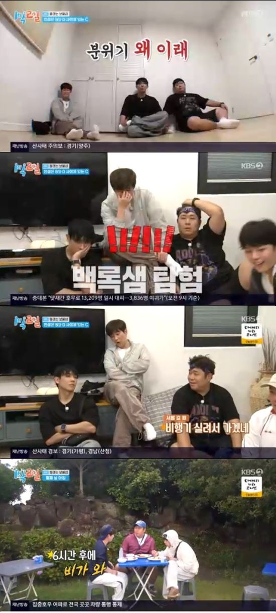 주종현PD는 B방의 탐험지가 산임을 알리며 백록샘 탐험을 하게 된다고 설명, 백록샘 팀은 새벽 6시, 돌고래 팀은 오전 8시 30분에 기상한다고 말했다.