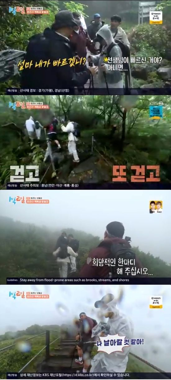 백록색 팀 멤버들은 올라갈수록 눈도 못 뜨고 얼굴이 따가울 정도로 비바람이 거세지는 극한의 상황에서도 등반을 이어갔다.