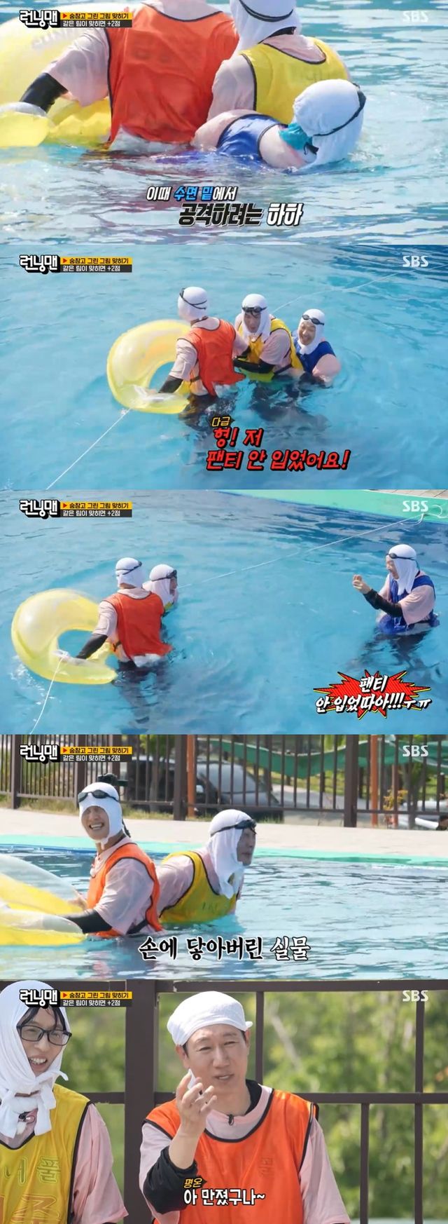 하하는 튜브 바로 앞에 서서 있는 김종국과 최다니엘 뒤에서 기회를 노렸고, 이어 물 아래에서 최다니엘을 안으며 공격을 시도했다.