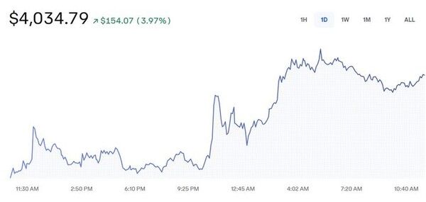 뉴시스 보도에 따르면, 암호화폐 거래소 코인베이스에서 이더리움은 미 동부시간 오후 1시35분(한국시간 9일 오전 2시30분)께 4000달러를 넘어섰다.
