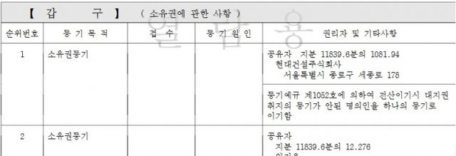 압구정동 465번지. 서울시 제외한 현대건설과 다수의 조합원들이 공유지분한 토지. 자료 출처 = 대한민국 법원 인터넷등기소