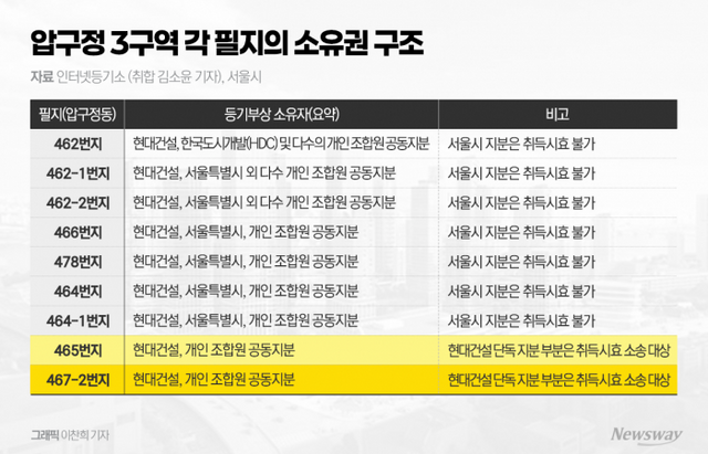 11일 <뉴스웨이> 가 압구정 3구역 각 필지의 소유권 구조를 등기부등본으로 확인한 결과, 총 9개 필지 중 7필지는 현대건설·HDC현대산업개발(구 한국도시개발)과 서울시, 그리고 다수의 개인 조합원이 공동 지분자로 등재돼 있었다. 나머지 2필지(465번지, 467-2번지)는 현대건설과 개인 조합원들만이 지분을 나눠 가진 것으로 확인됐다.