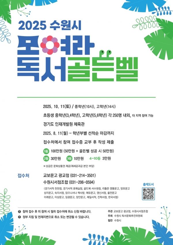 수원시가 ‘2025 수원 독서골든벨 대회’를 2025년 10월 11일(토)에 경기도 인재개발원 체육관(수원시 장안구 경수대로 1150)에서 개최한다고 밝혔다. 대회시간은 학년에 따라 초등 중학년인 3~4학년은 10시, 초등 고학년인 5~6학년은 14시이다.