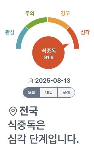 뉴시스 보도에 따르면, 이날 식품의약품안전처가 기상청, 국립환경과학원 등과 함께 개발한 식중독 예측 지도에 따르면 광주를 제외한 전국이 식중독 심각 단계에 해당됐다.