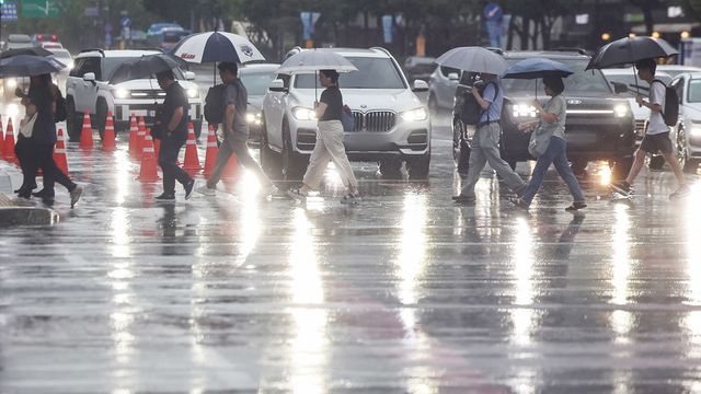 서울 지역에 호우주의보가 발령된 13일 서울 종로구 광화문네거리에서 우산을 쓴 시민들이 출근길 발걸음을 재촉하고 있다. / 뉴스1