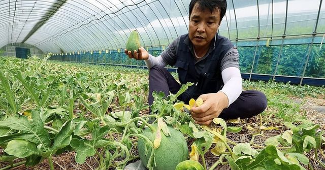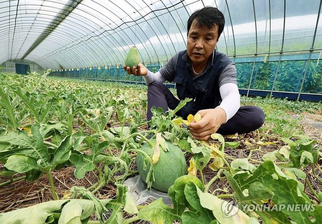 13일 광주 북구 금곡동 무등산수박마을에서 농장주 문광배 씨가 최근 과한 습도와 햇빛 과다 등 오락가락하는 날씨로 인해 타들어 가는 무등산수박 잎을 만지고 있다. / 연합뉴스