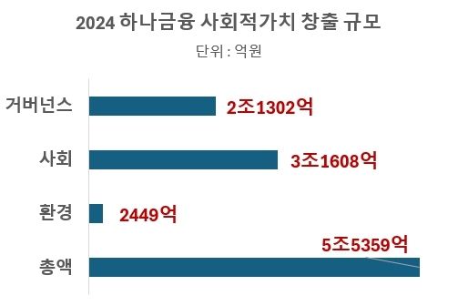 하나금융그룹의 2024년 ESG 경영 활동에 대한 항목별 성과는 ▲환경(E) 2449억원 ▲사회(S) 3조1608억원 ▲거버넌스(G) 및 경제적 기여 2조1302억원 등이다.