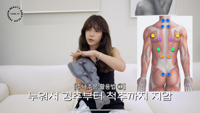 ‘부기 손절템’의 마지막은 어마무시한 비주얼을 자랑하는 추나추본이다. 경추부터 척추, 종아리까지 빈틈없이 커버하는 다재다능한 지압 도구다. 채정안은 이 아이템을 세 가지 방법으로 활용한다고 전했는데 먼저 바닥에 놓고 등을 대면, 경추부터 척추까지 이어지는 라인을 따라 압이 들어가 굳은 근육을 풀어준다. 두 번째는 허리에 대고 정상적인 척추 각도를 유지한 채 코어 근육을 자극하는 것. 마지막으로는 종아리에 맞춰 지압과 순환 관리를 동시에 하는 방법이다. 단순하지만, 사용 후 몸이 한층 가벼워지는 느낌 덕분에 채정안에게는 ‘만능 지압 도구’로 자리매김했다. 특히 하루 종일 앉아 있거나 운동 후 뭉친 부위가 있는 날이면, 이 추나추본이 빠르게 피로를 풀어주는 비밀 병기라고.