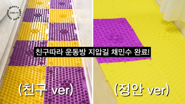 채정안이 올여름 ‘부기 손절’을 위해 꺼내 든 첫 번째 아이템은 다름 아닌 DIY 지압 매트다. 순환 관리에 진심인 친구의 추천으로 구매한 이 매트는, 밟자마자 험한 소리가 나오는 강렬함이 매력이다. 노란색과 보라색 매트를 길게 연결해 운동방 바닥에 깔아 두었는데, 지압 포인트가 발바닥 혈을 눌러 순환을 돕는다고 한다. 처음에는 발을 디딜 때마다 비명 소리가 절로 나오지만, 몇 번 걷다 보면 오히려 시원하고 다리 부종이 풀리는 느낌이 든다고. 가격대도 부담이 없어 집에서도 손쉽게 설치 가능! 하루 중 틈틈이 지압 매트를 걸어주는 것만으로도 피로와 부기를 완화하는 데 도움을 준다.