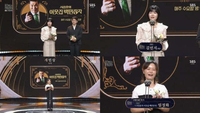 수상 소감에서 김민지 PD는 “‘이웃집 백만장자’는 단순히 눈에 보이는 자산이 아니라 그 뒤에 숨은 백만장자의 가치와 철학, 나눔의 의미를 전하는 방송”이라며, “매회 다양한 백만장자들을 만나며 이 시대의 좋은 어른을 만나는 기쁨이 있었다. 함께 흘린 땀과 노력이 결실을 맺은 것 같아 뜻깊다”라고 전했다. 이어 “함께 고생한 제작진, 기꺼이 삶의 이야기를 꺼내주신 12명의 백만장자분들, 그리고 날카롭고 따뜻한 시선으로 프로그램의 중심을 잡아주신 서장훈 선배님께 진심으로 감사드린다. 시즌1을 함께한 조나단 씨에게도 고마움을 전하고 싶다”라고 덧붙였다.