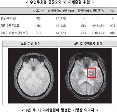 연구 결과, 중등도 이상의 폐쇄성 수면무호흡증을 가진 사람(193명)은 수면무호흡증이 없는 사람(812명)에 비해 뇌 미세출혈 발생 위험이 2.14배 높았다.