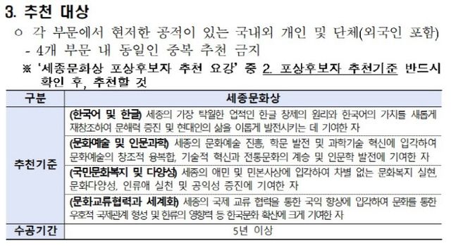 부문별 추천자격을 보면 한국어 및 한글 부문은 한글 창제의 원리와 한국어의 가치를 새롭게 재창조해 문해력 증진 및 현대인의 삶을 이롭게 발전시키는 데 탁월한 업적을 이룬 자에게 수여한다.