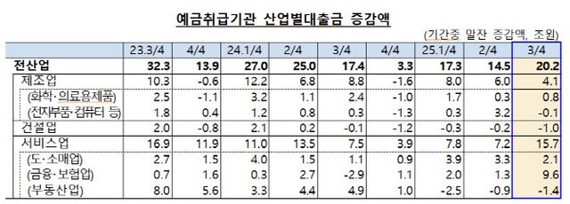 기업 규모별로는 예금은행에서 7조 9000억원 늘어나며 증가폭이 확대됐고, 중소기업에서는 10조 3000억원으로 크게 늘었다. 개인사업자는 2조 1000억원 늘어나며 증가 폭이 커졌다.