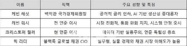 거론되고 있는 4명의 후보 모두 ‘현재 정책금리가 너무 높다’는 문제의식에는 동의하고 있는 만큼, 2026년 추가 금리 인하를 전제로 한 완화 기조 자체는 기정사실화됐다는 평가다. 다만 누가 의장이 되느냐에 따라 완화 속도와 강도가 달라질 전망이다.
