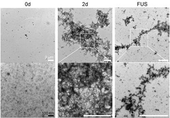 [전자현미경 촬영 결과, 뭉쳐있던 아밀로이드 응집체(2d)가 초음파 조사 후(FUS) 잘게 부서진 것을 확인할 수 있다.]