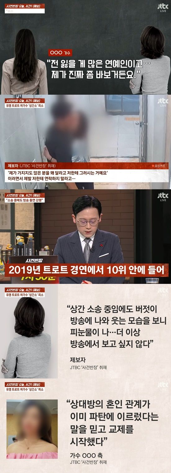 29일 JTBC ‘사건반장’에서는 유명 트로트 여가수가 상간 소송에 피소됐다는 내용을 전했다.